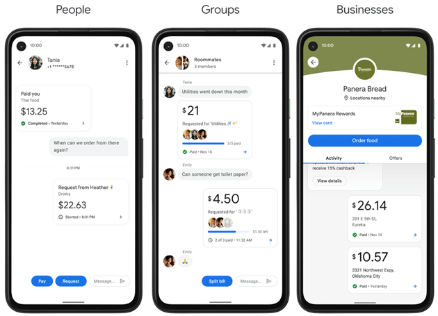 Anzichè mostrare un lungo elenco di transazioni, la nuova app Google Pay mostra le ricevute dei pagamenti tutte organizzate in conversazioni, quindi è possibile rapidamente vedere lo storico dei pagamenti effettuati verso una determinata azienda o gli scambi di denaro effettuati con un certo amico. Inoltre, se serve dividere la spesa di una cena, l’affitto o altre spese con più di una persona, è possibile creare un gruppo, dividere il conto e tenere traccia di chi viene pagato in un unico posto. Google Pay può anche aiutare anche a fare i conti su chi deve quanto. La nuova app Google Pay si può utilizzare anche per ordinare cibo in oltre 100.000 ristoranti, acquistare benzina in oltre 30.000 distributori di benzina e pagare per il parcheggio in oltre 400 città negli Stati Uniti.