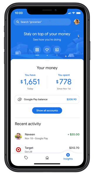 Collegando un proprio conto bancario o carte di credito a Google Pay, l’app fornirà riepiloghi periodici della spesa e mostrerà le tendenze di quanto si spende e altre informazioni nel tempo, offrendo una visione chiara delle proprie finanze. Google Pay è anche in grado di comprendere e organizzare automaticamente le spese, permettendo di cercare tra le transazioni in maniera più rapida. Ad esempio, cercando "cinema" e filtrando per "mese scorso" o "pizzeria" Google Pay troverà immediatamente le transazioni pertinenti.