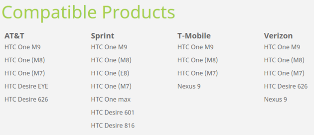I top di gamma HTC One M7, HTC One M8 e HTC One M9 supporteranno tutti Android Pay con i quattro principali operatori statunitensi. In più, AT&T supporterà i pagamenti attraverso Android Pay con HTC Desire Eye e Desire 626, mentre l’operatore Sprint con HTC One E8, One Max, Desire 616, e Desire 816, e solo T-Mobile e supporteranno i pagamenti da Nexus 9.