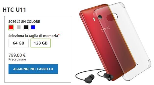 HTC U11 da 64GB è in vendita in Italia al prezzo di 749 euro, con spedizioni da giugno, mentre HTC U11 da 128GB è in vendita in Italia al prezzo di 799 euro, con spedizioni da settembre.