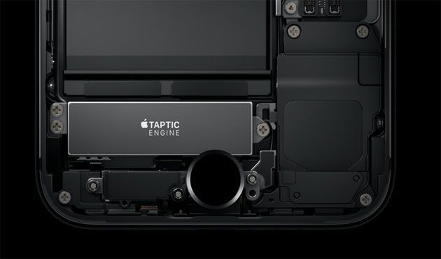 Invece di un meccanismo fisico, Apple ha scelto di affiancare al tasto Home degli iPhone 7 il motore Taptic Engine per fornire all’utente la sensazione che il pulsante viene fisicamente premuto, tramite una leggera vibrazione. Apple in iPhone 6s e 6s Plus ha adottato un nuovo motore Taptic Engine state-of-the-art che reagisce all’intensità con cui si preme sul display e comunica all’utente quali azioni sta eseguendo e cosa sta per succedere – nei nuovi iPhone 7 il Taptic Engine è stato rinnovato per funzionare anche con il pulsante Home capacitivo, rilasciando una breve vibrazione quando lo si preme per far sembrare che fisicamente lo si sta premendo – se si prova pero’ a premerlo col telefono spento, non si percepisce alcuna vibrazione.