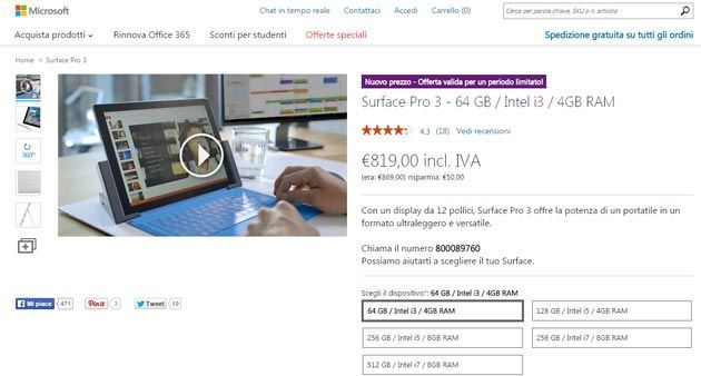 DISPONIBILITA’ IN ITALIA DI SURFACE PRO 3. Surface Pro 3 è disponibile in Italia al prezzo al dettaglio a partire da 869 euro (al lancio nel mese di agosto i prezzi partivano da 819 euro). OFFERTA LAST MINUTE AL 18 GIUGNO. Per un tempo limitato, sul Microsoft Store online (microsoftstore.com) è possibile risparmiare fino a €150 sull’acquisto di un nuovo Surface Pro 3. Gli sconti vanno da 50 euro a 150 euro e si applicano a tutta la lineup. Ecco i prezzi scontati dei vari modelli: