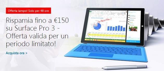 Solo tra oggi e domani (fino al 18 giugno), Microsoft ha attivato una campagna di sconti per risparmiare fino a €150 sull’acquisto di un nuovo Surface Pro 3. Gli sconti vanno da 50 euro a 150 euro e si applicano a tutta la lineup. Il prezzo base di Surface Pro 3 con core i3 e 4 GB di RAM è di 869 euro, ma, con i 50 euro scontati da Microsoft il prezzo scende a 819 euro. Per acquistare il vostro Surface 3 a prezzo scontato visitate il sito http://www.microsoftstore.com/