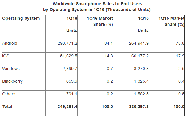 Le vendite globali di smartphone secondo il report di Gartner sono state pari a 349 milioni di unità nel primo trimestre del 2016, un aumento del 3,9 per cento rispetto allo stesso periodo nel 2015. Le vendite di smartphone hanno rappresentato il 78 per cento del totale delle vendite di telefoni cellulari nel primo trimestre del 2016. Le vendite di smartphone sono state guidate dalla domanda di smartphone a basso costo nei mercati emergenti e degli smartphone 4G a prezzi accessibili, secondo Gartner, grazie alle promozioni dei fornitori di servizi di comunicazione in molti mercati di tutto il mondo.