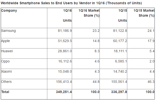 Oppo ha avuto la migliore performance nel primo trimestre 2016, spostandosi in quarta posizione con una crescita delle vendite di unità del 145 per cento. Come Huawei e Xiaomi, Oppo ha visto una forte crescita in Cina, dove hanno invece perso quota Lenovo, Samsung e Yulong. Huawei ha registrato una forte domanda di smartphone in Europa, nelle Americhe e in Africa, mentre Xiaomi e Oppo hanno visto aumentare le loro vendite di smartphone in Asia/Pacifico.