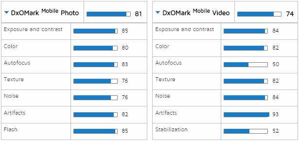 Entriamo nel dettaglio di questi 78 centesimi. Per quanto concerne lo scatto delle foto, il valore più basso lo ottengono la gestione del rumore e la qualità della texture, entrambe con 76. La resa del colore invece si aggiudica un 80/100. Tutti gli altri parametri, come esposizione e contrasto, messa a fuoco automatica, artefatti, flash tendono verso l’85. Ciò significa che le foto saranno di buona qualità, anche verso sera quando la luce comincia a mancare.