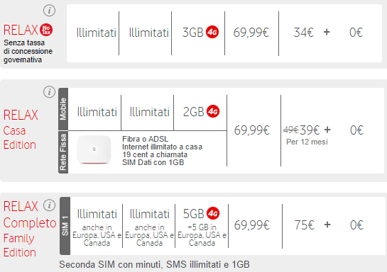– Relax Completo Family Edition: a 75 euro al mese inclusi Minuti illimitati (anche in Europa, USA e Canada), SMS illimitati (anche in Europa, USA e Canada), 5GB di internet 4G (+5 GB in Europa, USA e Canada). Inclusa anche Seconda SIM con minuti, SMS illimitati e 1GB di Internet. E’ previsto un contributo iniziale per lo smartphone di 69,99 euro.