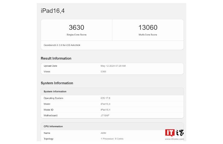 Il punteggio nella attività single core è 3630 mentre il punteggio dell’attività multi core è 13.060. Tra le specifiche del modello testato si nota che il modello con 9 core monta iPad OS 17.6, una versione non ancora rilasciata.