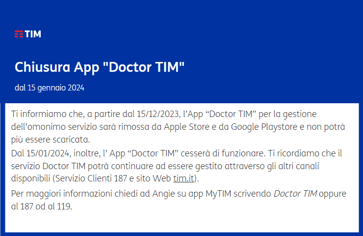 TIM ha comunicato che, a partire dal 15 dicembre 2023, l’applicazione “DoctorTIM” per dispositivi iOS e Android sarà rimossa dai rispettivi store. L’app non potrà quindi più essere scaricata da Apple Store e da Google Play Store. Per gli utenti che hanno già l’app installata sul proprio dispositivo mobile, l’app non funzionerà più dopo il 15 gennaio 2024.