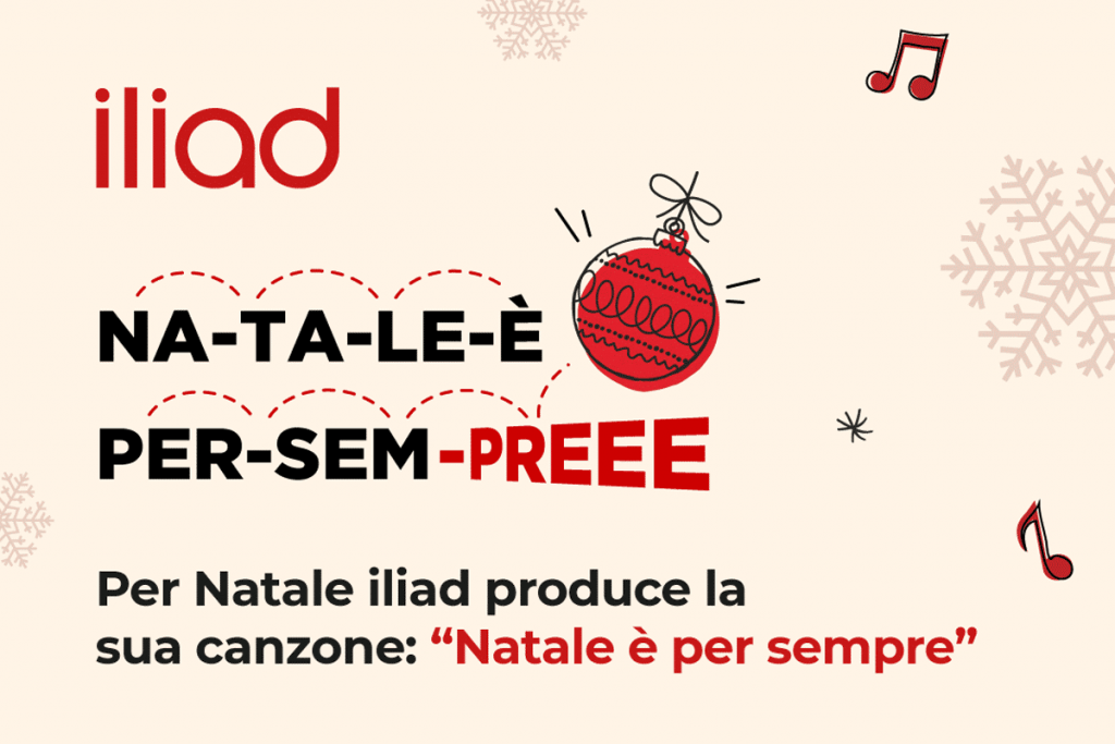 L’operatore Iliad ha presentato la sua prima canzone di Natale originale, si intitola “Natale è per Sempre” ed è disponibile sulle principali piattaforme di streaming. Rientra nella campagna “Con Iliad Natale è per sempre”, che già comprende l’offerta speciale ‘FLASH 180‘ disponibile fino al prossimo 28 dicembre 2023.