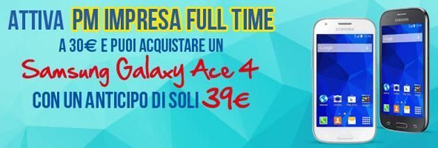Entro il prossimo 22 marzo il piano PM Impresa Full Time è possibile abbinarlo all’acquisto di un Samsung Galaxy Ace 4 con un anticipo di soli 39 euro e una rata di soli 6 euro/mese per 24 mesi già inclusa nel costo mensile del piano offerto in promozione a 30 euro anziché 42 euro.