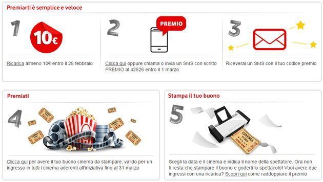 Tutti i clienti Vodafone YOU che ricaricano la propria SIM Vodafone di almeno 10 euro a Febbraio 2015, riceveranno un buono cinema valido per un ingresso in tutti i cinema aderenti all’iniziativa fino al 31 Marzo 2015.