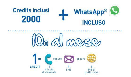 Ciascun Credit viene scalato al raggiungimento di 1 minuto di traffico voce o di 1 MB di navigazione (ad esclusione dei MB consumati per la navigazione sull’App ufficiale WhatsApp), oppure all’invio di 1 SMS.
