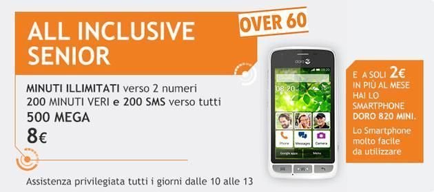 E’ inoltre possibile avere il telefono assieme con l’offerta Wind All Inclusive Senior, che con un contributo mensile di 8 euro ogni 4 settimane è possibile avere chiamate illimitate verso 2 numeri, 200 minuti veri, 200 sms verso tutti e 500 Mega. Incluso anche il servizio di assistenza telefonica privilegiata con accesso diretto all’operatore (numero 155 tutti i giorni dalle 10.00 alle 13.00).
