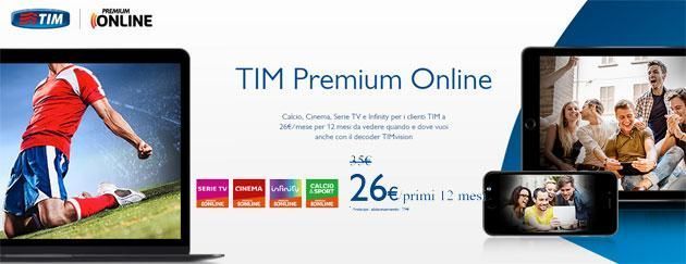 L’offerta TIM Premium Online si rivolge a coloro che hanno un collegamento in fibra ottica o ADSL di TIM, fruibile anche su rete mobile (3G e 4G), e che non vogliono abbonarsi a Mediaset Premium in maniera tradizionale via digitale terrestre (molte zone d’Italia ad esempio non sono raggiunte dal segnale DTT). Per gli utenti fibra ottica o ADSL veloce di TIM c’è la possibilità di accedere al catalogo di Premium Online anche in Alta Definizione.