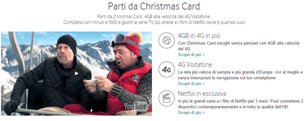 Christmas Card costa 10 euro ogni 4 settimane e si rinnova in automatico lo stesso giorno in cui si rinnova la propria tariffa base. Dopo i primi 3 rinnovi Christmas Card si rinnova in automatico con 2GB in 4G a 10 euro ogni 4 settimane. Dopo i primi 3 mesi, Netflix si rinnova a 9,99 euro al mese. Disattivando l’offerta Vodafone, anche il contenuto verrà disattivato.