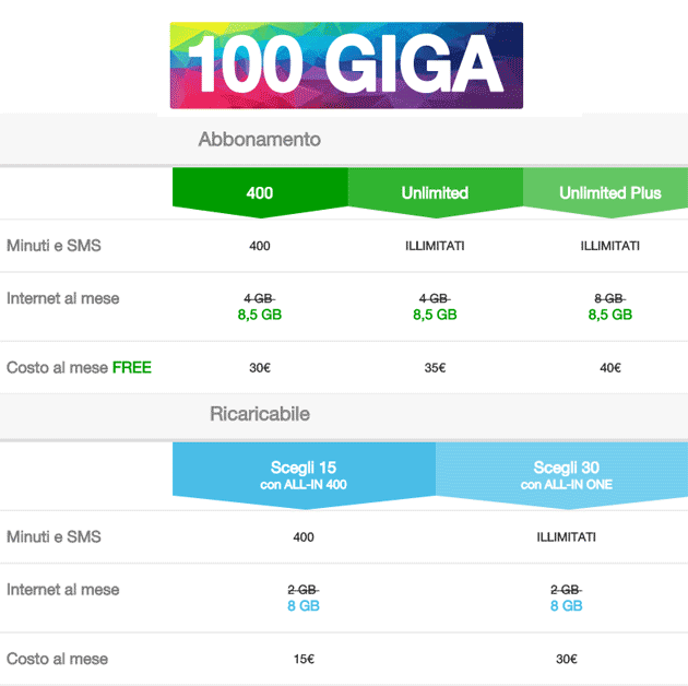 Sono tre i tagli dell’offerta FREE con la promozione 100Giga inclusa: