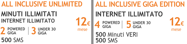 Le offerte Wind All Inclusive "Celebration" si dividono in All Inclusive Unlimited con minuti illimitati, 2GB di internet e 500 SMS verso tutti oppure la All Inclusive Giga Edition con 500 minuti e 500 SMS verso tutti e 4GB di internet al costo di 12 euro ogni 4 settimane. E per i clienti under 30 che attivano un’ offerta ricaricabile All Inclusive, Wind regala 1 Giga aggiuntivo.