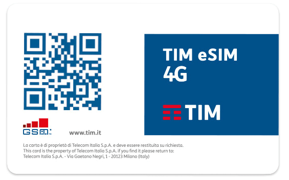 Ad esempio, la “TIM eSIM” è il voucher di TIM con codice di attivazione, che permette di scaricare il profilo sulla eSIM presente all’interno del dispositivo e che, una volta attivato, consente di utilizzare il dispositivo associato. Oltre al codice di attivazione (QR-Code) sulla “TIM eSIM” sono presenti il numero telefonico ed il codice ICCID associati al profilo eSIM. Contiene, inoltre, i codici PIN e PUK da utilizzare per proteggere l’utilizzo del dispositivo.