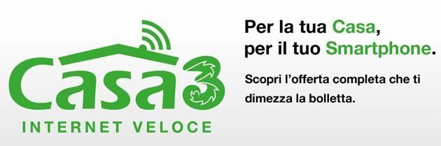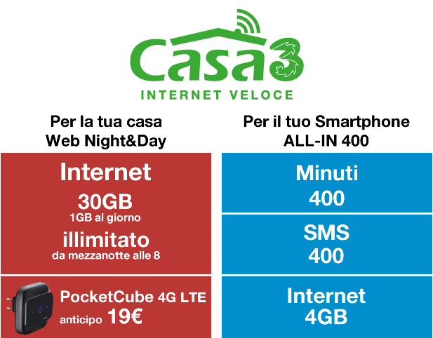 COSA INCLUDE CASA3: L’offerta Casa3 prevede l’attivazione contestuale, sulla stessa anagrafica cliente, della Ricaricabile voce ALL-IN 400 Pack al costo promozionale di 5€ al mese anziché 10€ e del piano Abbonamento dati Web Night&Day Pack al costo promozionale di 10€ al mese anziché 20€ per 30 mesi dalla data di attivazione. ALL-IN 400 Pack offre ogni settimana 100 minuti e 100 SMS nazionali verso tutti e 1 GB di Internet LTE sotto rete 3. Soglie settimanali non cumulabili.