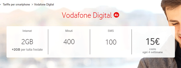 Vodafone Digital in breve: al prezzo di 15 euro ogni 4 settimane offre 400 minuti e 100 SMS verso tutti i numeri fissi e mobili nazionali e 2GB in 4G. Vodafone Digital sembrerebbe essere un’offerta pensata per gli utenti ‘digitali’ ma al costo di 15 euro per ogni rinnovo 2GB sono molto pochi, e a conti fatti è un’offerta alquanto costosa.