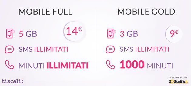 Tiscali Mobile GOLD al costo di 9 euro ogni 28 giorni offre 1000 minuti di conversazione gratuiti verso tutti (fissi e mobili), SMS illimitati verso tutti, 3 GB di traffico dati con velocità a 42,2 Mbps. Tiscali Mobile FULL al costo di 14 euro ogni 28 giorni offre illimitati minuti di conversazione gratuiti verso tutti (fissi e mobili) e SMS illimitati verso tutti, oltre a 5 GB di traffico dati con velocità a 42,2 Mbps.
