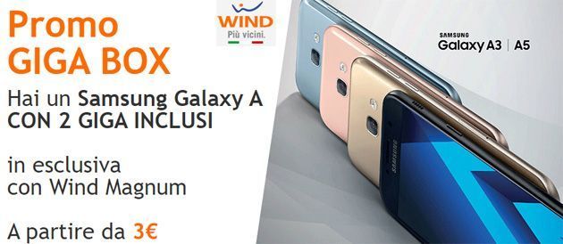 Wind ha attivato la promozione GIGA BOX che, fino al 23 aprile 2017, permette di avere un Samsung Galaxy A 2017 con 2 Giga inclusi in esclusiva con le offerte Wind Magnum a partire da 3 euro.