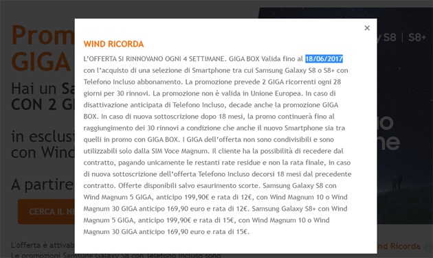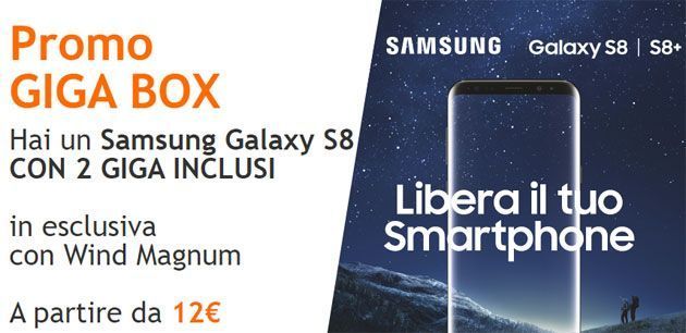 Wind con la promozione GIGA BOX fino al 18 giugno 2017 permette di avere un Samsung Galaxy S8 o S8+ con 2 Giga inclusi in esclusiva con l’offerta Telefono Incluso abbonamento a partire da 12 euro ogni quattro settimane.