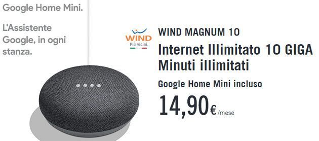Con la promozione Wind Magnum 10 Giga al costo di 14,90 euro al mese si hanno a disposizione 10 giga di internet e minuti illimitati. I giga raddoppiano con Wind Plus. In promo, incluso nel canone di abbonamento uno speaker Google Home Mini.