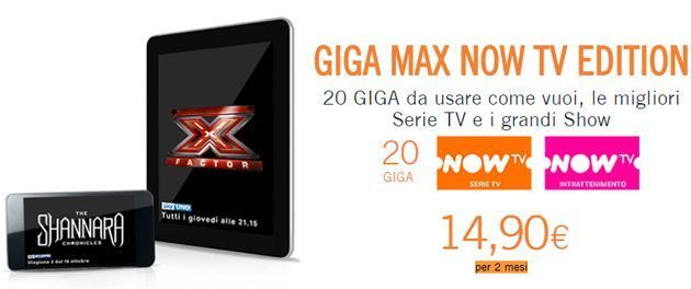 COMPONENTE NOW TV MOBILE. La parte NOW TV Mobile dell’offerta consente l’accesso ai contenuti dei Ticket Mobile “SERIE TV” e “INTRATTENIMENTO” solo sui dispositivi mobili di tipo smartphone e tablet compatibili. L’offerta ha una durata di 2 mesi (60 giorni) dalla data di attivazione e si disattiva in automatico al termine di questo periodo. La visione dei contenuti “Serie Tv” e “Intrattenimento” inclusi, disponibile solo su territorio italiano, è condizionata all’accesso alla piattaforma NOW TV e all’accettazione e al rispetto delle condizioni generali del servizio NOW TV. Per i clienti con offerta NOW TV Mobile attiva i 2 mesi inclusi nell’offerta GIGA Max NOW TV Edition saranno fruibili al termine del periodo già prepagato dell’offerta NOW TV Mobile. Per usare Now TV Mobile è necessario scaricare l’app Now TV da Play Store o Apple Store. Per i clienti NOW TV con un’offerta attiva diversa da NOW TV Mobile, l’offerta GIGA Max NOW TV Edition prevede l’attivazione o l’estensione, per un periodo di 2 mesi, del Ticket Serie TV fruibile su PC, Tablet, Smartphone, Chromecast, Game Console, Smart TV Samsung e NOW TV Box.