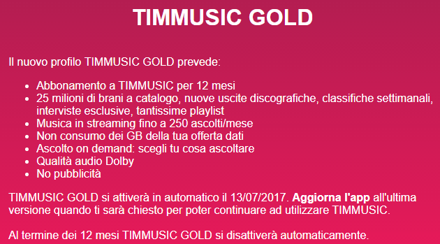 Gli utenti che hanno ricevuto il sopra citato SMS si sono visti modificare in automatico il profilo ‘TIMmusic’ in ‘TIMmusic Gold’ il 13 luglio, ed è stato per loro necessario aggiornare l’app TIMmusic all’ultima versione per continuare ad utilizzare il servizio col nuovo profilo. TIMmusic è un servizio che la maggior parte degli utenti TIM utilizzano finchè compreso nella propria offerta senza costi aggiuntivi, e presumibilmente sono pochi gli utenti che scelgono di abbonarsi a TIMmusic pagando 7,99 euro al mese per usufruire di un servizio non paragonabile ai concorrenti – ad esempio di Spotify.