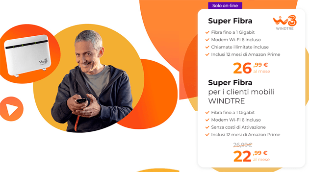 L’operatore WindTre propone per la casa l’offerta Super Fibra che comprende, a casa, Fibra senza limiti fino a 1000Mb con modem incluso e, in mobilità, su smartphone con SIM WindTre giga senza limiti. L’offerta prevede un costo da 26,99 euro al mese se non si è già clienti WindTre, da 22,99 euro/mese se si è già clienti WindTre mobile, in entrambi i casi con attivazione inclusa e modem incluso ma solo se si attiva online entro il 24 gennaio 2022, salvo proroga. E per un periodo limitato, in regalo 12 mesi di Amazon Prime.