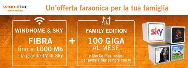 Attivabile fino al 17 giugno 2018, WindHome e Sky include la connettività internet dentro e fuori casa e la TV di Sky al costo di 34,90 euro al mese per il primo anno (Sky incluso), poi 24,90 euro dal 13esimo rinnovo (Sky escluso).