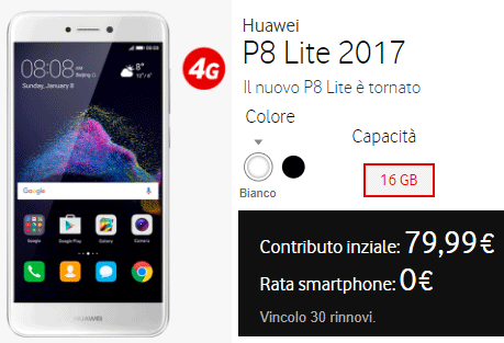 I clienti Vodafone – quindi chi ha già una SIM Vodafone – puoì’ acquistare lo smartphone Huawei P8 Lite 2017 a rate al prezzo di 0 euro ogni 4 settimane con 79,99 euro di contributo iniziale. Il canone di rinnovo è in promo a zero euro solo per questo Natale, al posto del prezzo normale di 6 euro a rinnovo. Pertanto, in 30 rinnovi, si risparmiano 180 euro. Lo smartphone costerebbe senza vincoli 249,99 euro.