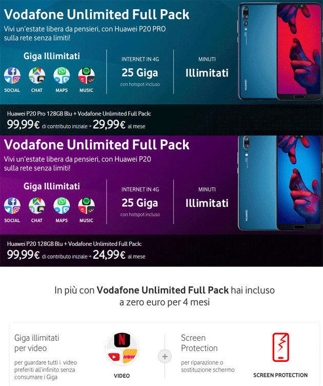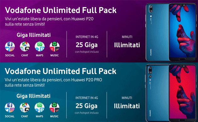 Piu’ in particolare, Vodafone Unlimited Full Pack include uno smartphone Huawei P20 o Huawei P20 Pro a 99,99 euro di contributo iniziale e rata rispettivamente di 24,99 euro e 29,99 euro con inclusi 1000 minuti, 25GB e hotspot Pass Social, Chat, Maps e Music (e Video per i primi 4 mesi). Le pagine dell’offerta sul sito vodafone.it non riportano la durata contrattuale, anche se presumibilmente è dei soliti 30 mesi, rimandando ad approfondire l’offerta presso un negozio Vodafone.