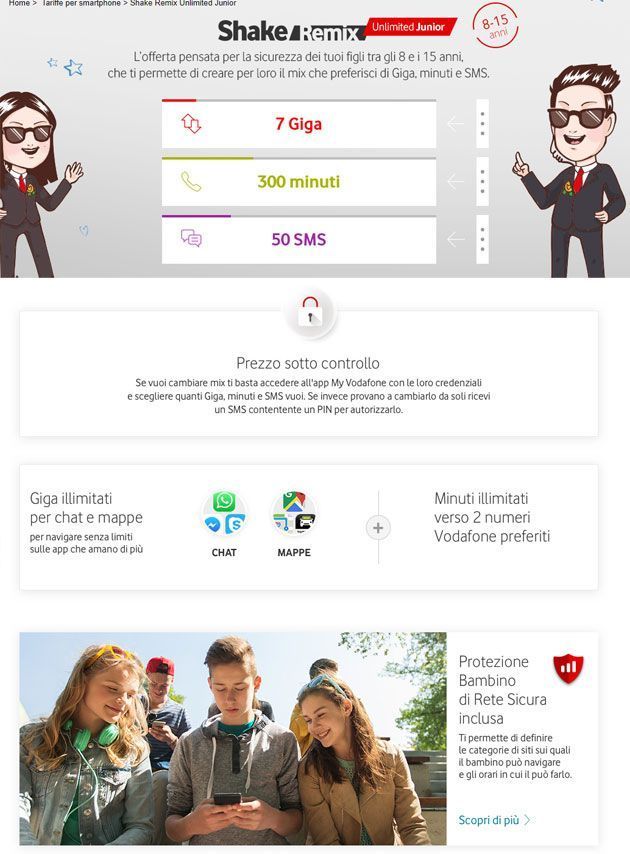 Per i piu’ giovani, ossia ragazzi che hanno tra 8 e 15 anni, è disponibile Vodafone Shake Remix Unlimited Junior che offre in piu’ rispetto a Vodafone Remix Unlimited per Under 30 le chiamate illimitate verso 2 numeri Vodafone e l’opzione Rete Sicura gratis per sempre (Protezione Bambino) che consente ai genitori di definire il livello di protezione più adeguato tra due profili standard (Bambino con navigazione solo su siti sicuri, per un massimo di 2 ore al giorno; Ragazzo con navigazione solo durante il pomeriggio, con blocco di contenuti pericolosi e violenti) o creandone uno personalizzato. Per attivarla bisogna associare alla SIM Vodafone del bambino il numero di telefono di un adulto e creare un PIN. In caso di smarrimento, tale PIN viene inviato via SMS al numero dell’adulto associato. Selezionando il profilo personalizzato è possibile definire il numero massimo di ore di navigazione, gli orari in cui il bambino può navigare e le categorie di siti internet che può visitare. I profili di navigazione e delle categorie inibite consigliate da Vodafone sono state selezionate da Fondazione Vodafone Italia, che da oltre 10 anni collabora con organizzazioni non governative per la tutela dei minori.