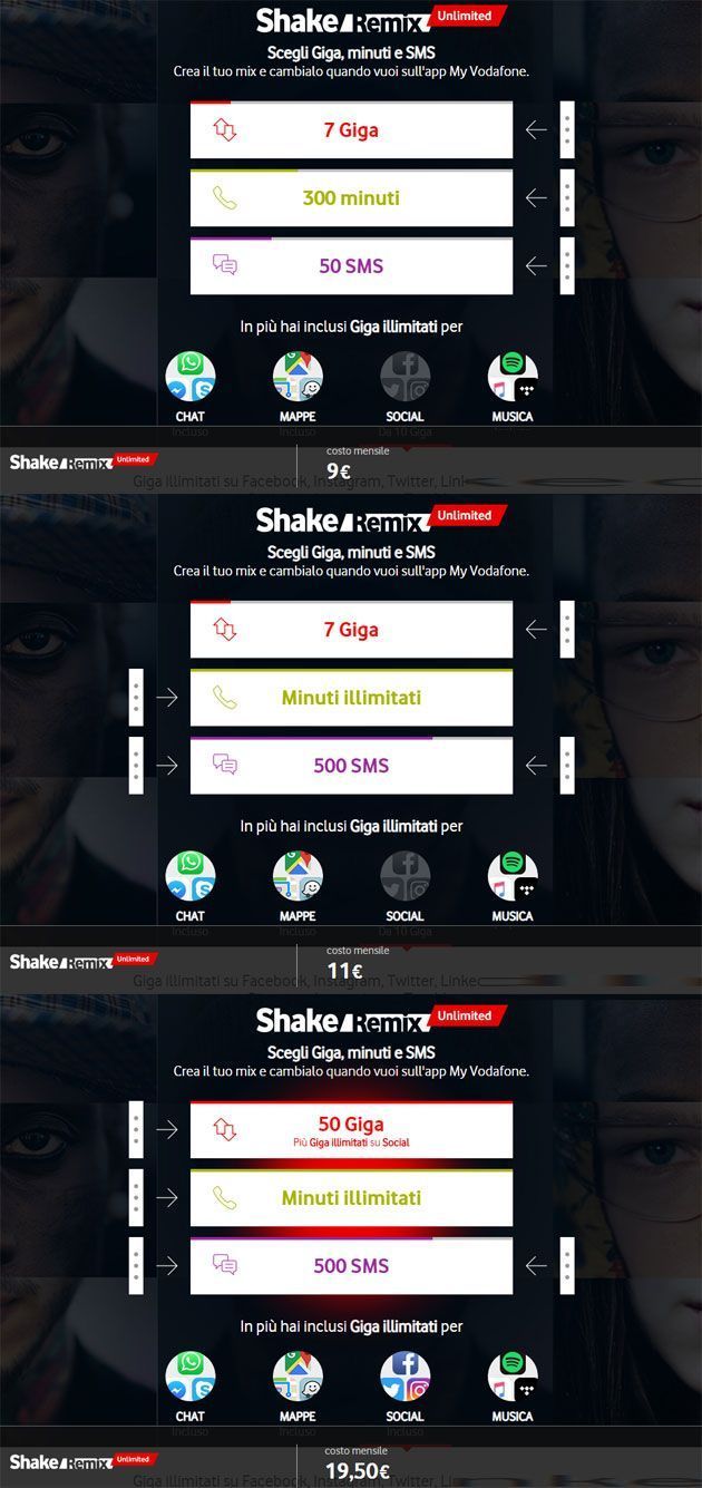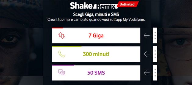 Vodafone Italia propone Shake Remix Unlimited, un rinnovamento della offerta Shake Remix lanciata nel 2017 per under 30, che consente di scegliere la quantità di Giga, minuti e SMS. Con Shake Remix Unlimited è possibile crearsi la propria offerta partendo da 9 euro al mese con inclusi 7 giga di internet, 300 minuti e 50 SMS e giga senza limiti nelle app di Chat, Mappe e Musica. E’ attivabile solo dagli Under 30, ossia dai minori di 30 anni.