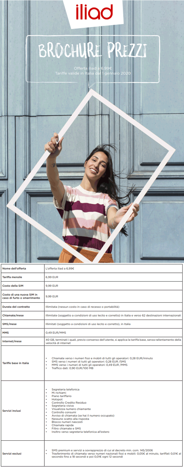 L’offerta da 6,99 euro al mese di Iliad comprende minuti illimitati verso fissi e mobile in Italia e verso fissi e mobili internazionali (oltre 60 destinazioni, verso fissi in Europa e fissi e mobili in USA, Canada), SMS illimitati verso fissi e mobile nazionali, 40GB in 4G/4G+ (superati i 40GB, previo espresso consenso, si continua a navigare a 0,90 euro ogni 100MB), e in Europa sono inclusi minuti e SMS illimitati e 4GB di internet.