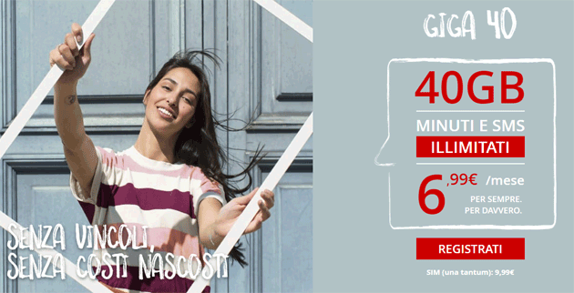 A 6,99 euro al mese 40GB di internet in Italia, minuti illimitati, SMS illimitati, minuti illimitati verso oltre 60 destinazioni mentre in Europa minuti e SMS illimitati e 3 giga.