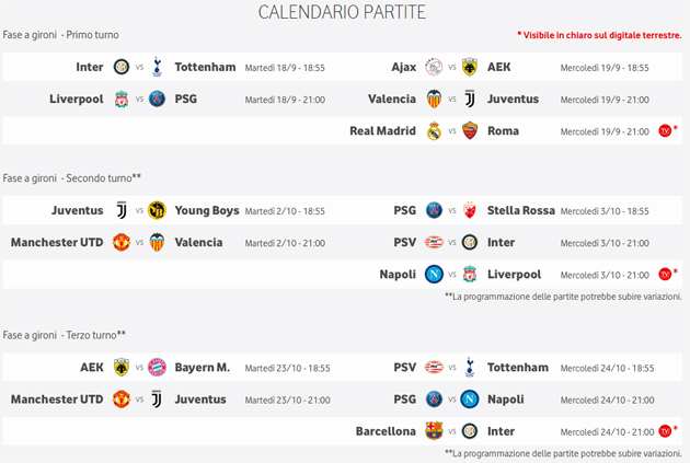 Le precedenti partite trasmesse da Sky Sport Mix HD su Vodafone TV sport sono: Inter-Tottenham e Liverpool-PSG del 18 settembre, Valencia-Juventus e Ajax-AEK del 19 settembre, Juve-Young Boys e Manchester United – Valencia del 2 ottobre e PSG-Stella Rossa e PSV-Inter il 3 ottobre, AEK-Bayern M. e Manchester UTD-Juventus del 23 ottobre, PSV-Tottenham e PSG-Napoli del 24 ottobre, CSKA Mosca-Viktoria Plzen e Juventus-Valencia il 27 novembre, Atletico Madrid-Monaco e Napoli-Stella Rossa il 28 novembre.