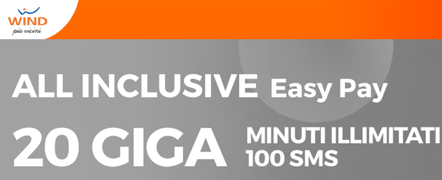 Wind All Inclusive Easy Pay offre 20 giga di internet, minuti illimitati e 100 SMS al mese al costo di 9,99 euro mensili; chi ha meno di 30 anni al costo ridotti di 8,99 euro al mese puo' avere 30 giga.