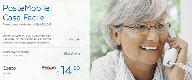 Dal 4 febbraio al 16 marzo 2019 l’operatore mobile virtuale PosteMobile propone l’offerta di telefonia fissa “PosteMobile Casa Facile”, parte della soluzione per la telefonia fissa “PosteMobile Casa”, il servizio di telefonia vocale fissa che utilizza la rete radiomobile PosteMobile.