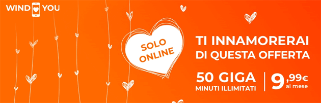 In occasione di San Valentino 2019, per chi passa a Wind o attiva una nuova SIM online è disponibile l’offerta Wind Smart Loves You, che include minuti illimitati e 50 Giga al prezzo di 9,99 euro al mese. Si puo’ attivare solo fino al 14 febbraio 2019.