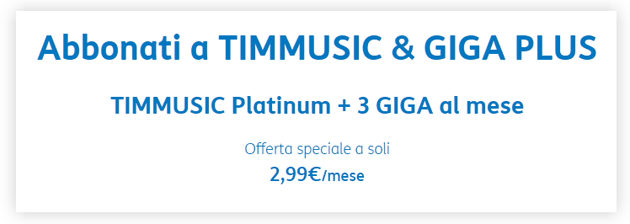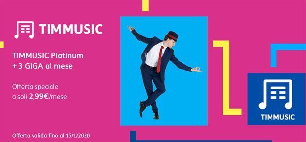 TIM ha lanciato la promozione TIMMUSIC & GIGA PLUS che combina l’abbonamento TIMmusic Platinum a 3 giga di internet al mese in una sola offerta, disponibile al costo di 2,99 euro al mese. L’offerta è disponibile solo fino al 15 gennaio, salvo rinnovo.