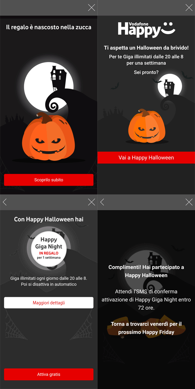 Per Halloween 2019, solo ad alcuni clienti, Vodafone sta regalando in questi giorni l’attivazione della promozione "Happy Giga Night" che consente di avere giga illimitati ogni giorno dalle 20 alle 8 per una settimana.