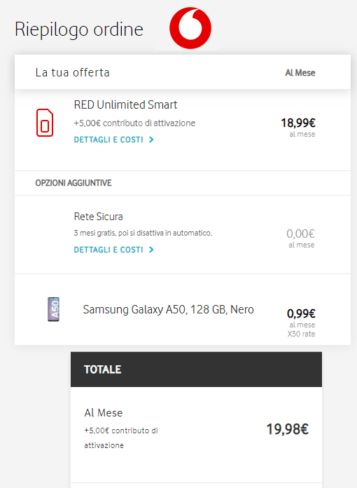 Simulazione ordine Samsung Galaxy A50 con Vodafone RED Unlimited Smart senza anticipo a 19,98 euro al mese