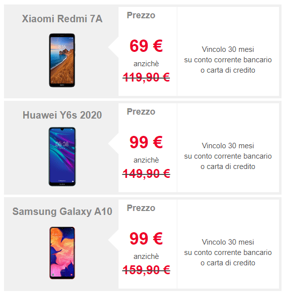 Gli smartphone sopra elencati possono essere acquistati al prezzo scontato da tutti i clienti Ricaricabili TIM con un’offerta dati attiva sottoscrivendo un contratto della durata di 30 mesi con rate mensili da 0,01 euro su carta di credito dei circuiti abilitati Visa, Mastercard, Amex (non sono accettate le carte prepagate) oppure su conto corrente bancario. L’attivazione comporta l’acquisto immediato del prodotto ed il pagamento di un anticipo di 69 euro o di 99 euro in funzione del prodotto scelto. Cessando l’offerta di rateizzazione prima della scadenza contrattuale (30 mesi), o cessando una delle opzioni associate, verranno addebitati i corrispettivi per cessazione anticipata contrattualmente previsti in funzione del prodotto acquistato.