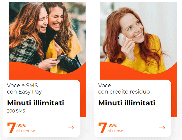 L’offerta ‘Voce e SMS con Easy Pay’ è disponibile solo con modalità di magamento ‘Easy Pay’, quindi con carte di credito, conto corrente e carte conto. ‘Voce con Credito Residuo’ si può pagare solo con credito residuo.