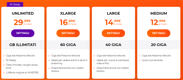 Per tutte le offerte Medium, Large, XLarge e Unlimited i giga sono alla massima velocità disponibile a seconda delle capacità del dispositivo da cui ci si connette e alla copertura. Solo WinTre Unlimited è 5G Ready, le altre si limitano all’accesso alla rete 4G.
