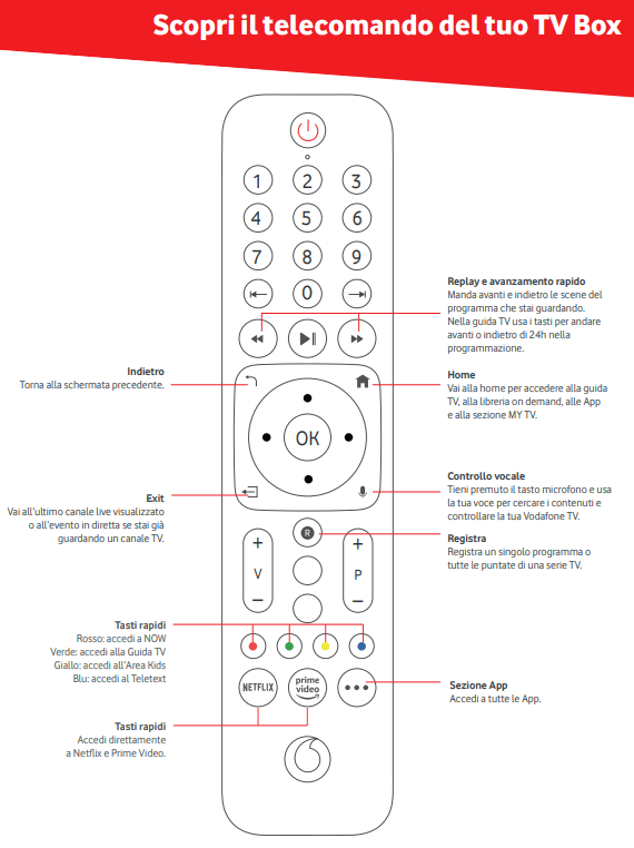 Il nuovo TV Box Pro offre il controllo vocale, il che significa che è possibile trovare alcuni contenuti attraverso la comoda e veloce ricerca vocale accessibile tenendo premuto il tasto con il microfono sul nuovo telecomando con bluetooth. La ricerca viene effettuata contemporaneamente in tutte le aree della Vodafone TV: My TV, Programmi in onda, On demand e nella maggior parte delle applicazioni disponibile. Con il controllo vocale è anche possibile cercare film/serie tv per titolo, cast, regista ,genere, anno… Il nuovo telecomando consente anche l’accesso rapido alle app di Netflix e Prime Video.